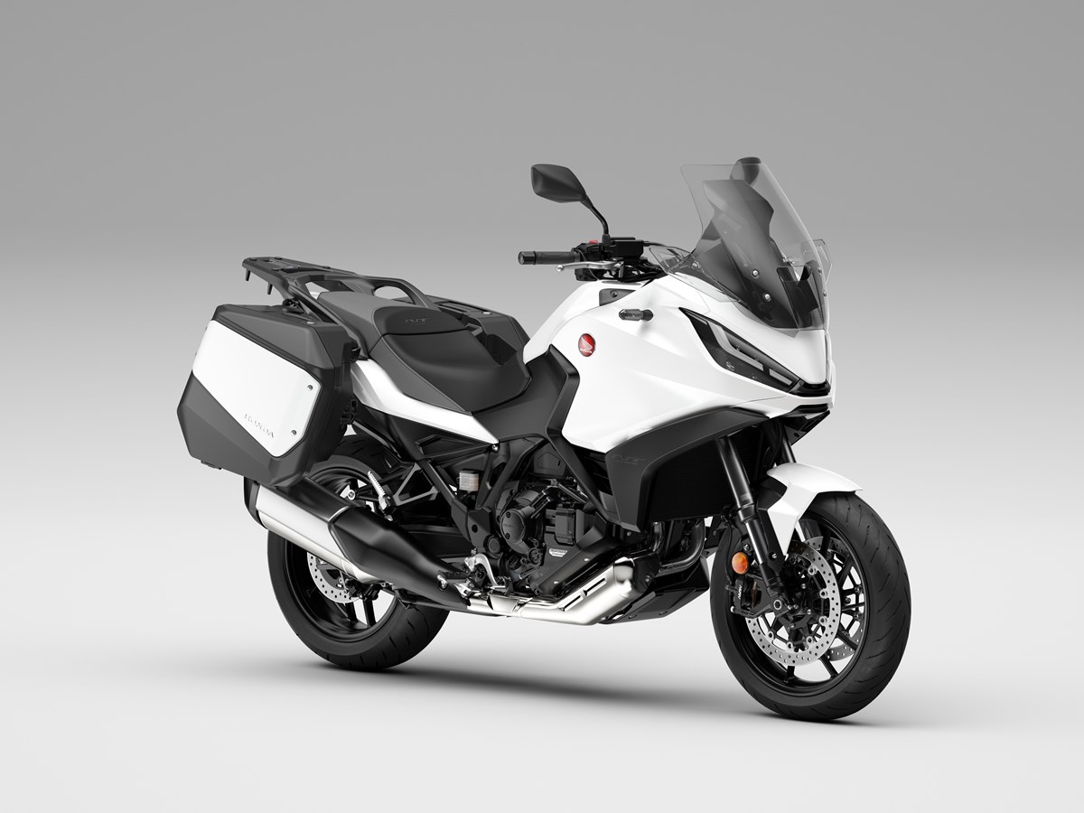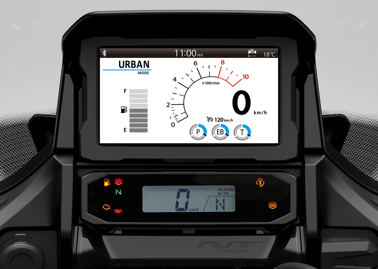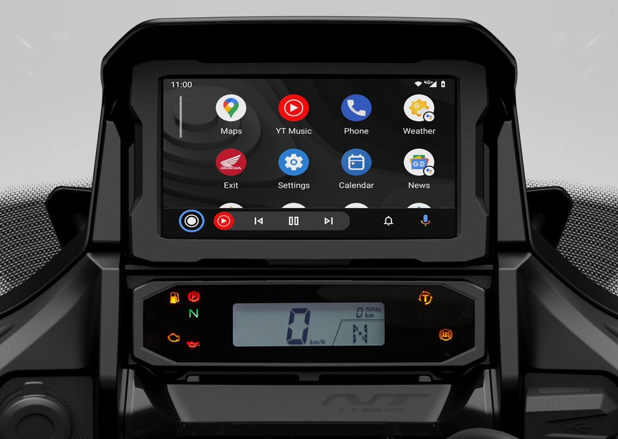 Una nueva generación de Honda tourer hace su debut. Tomando el corazón de la CRF1100L Africa Twin como punto de partida, la NT1100 aprovecha esta base para ofrecer un comportamiento ágil, cómodo y divertido. Un asiento a baja altura y una geometría de dirección agresiva se combinan con suspensiones de altas especificaciones para crear un conjunto deportivo. La pantalla parabrisas ajustable en altura y ángulo en 5 posiciones y los deflectores de viento superiores e inferiores garantizan la eficiencia aerodinámica a alta velocidad y una excelente protección contra los elementos; el control de crucero viene de serie, así como maletas estrechas y puños calefactables. Las ayudas a la conducción incluyen 3 modos de conducción por defecto y 2 opciones USER personalizables, Control de Tracción Seleccionable Honda (HSTC) y Control de Wheelie. Las pinzas delanteras de cuatro pistones y anclaje radial proporcionan la potencia de frenada y los neumáticos, de 120/70-17 el delantero y 180/55-17 el trasero, el agarre. Una pantalla táctil TFT de 6,5 pulgadas completa unas especificaciones premium y cuenta con conectividad Apple CarPlay® y Android Auto®.